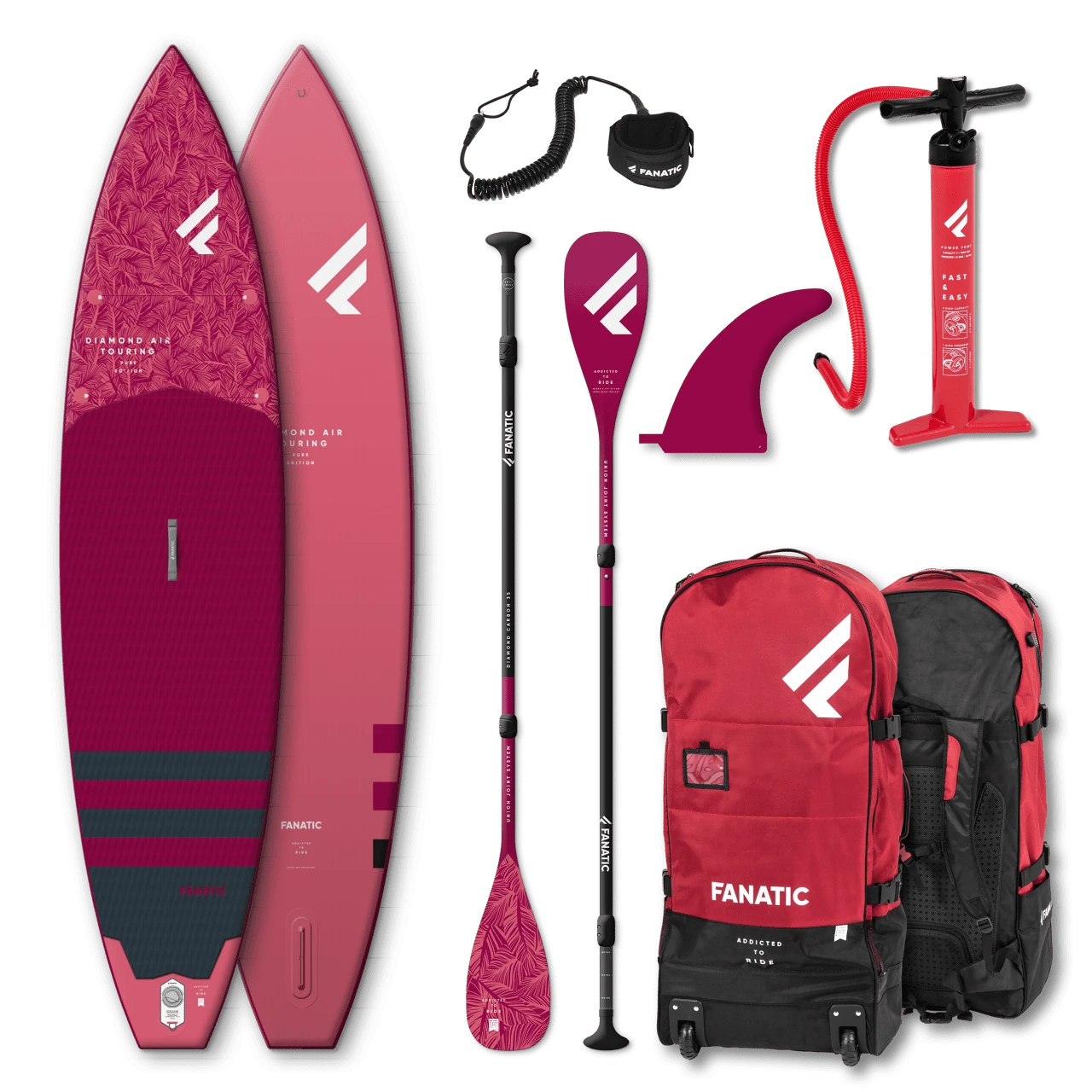 Lieferumfang: Diamond Air Touring 11’6″ SUP; Diamond Carbon 35 3-teiliges SUP Paddel; Fanatic Leash; 19,5 cm US Finne; Pumpe; Boardbag