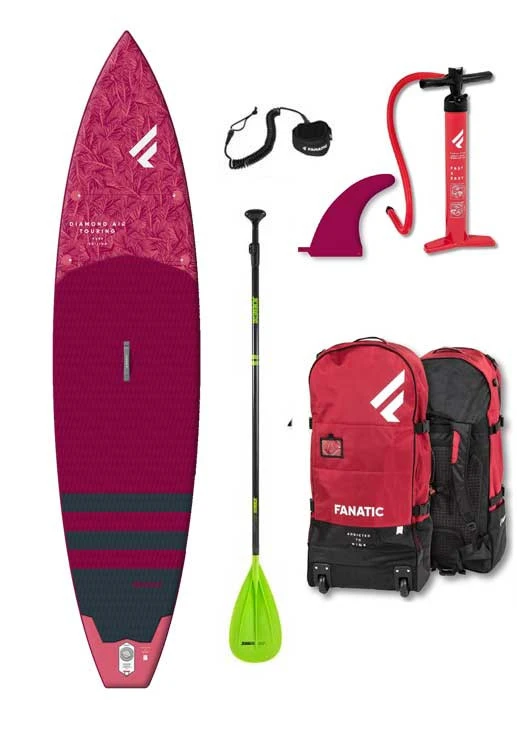 Lieferumfang: Diamond Air Touring SUP; 3 teiliges SUP Paddel; Fanatic Leash; 19,5 cm US Finne; Premium Backpack, Doppelhubpumpe