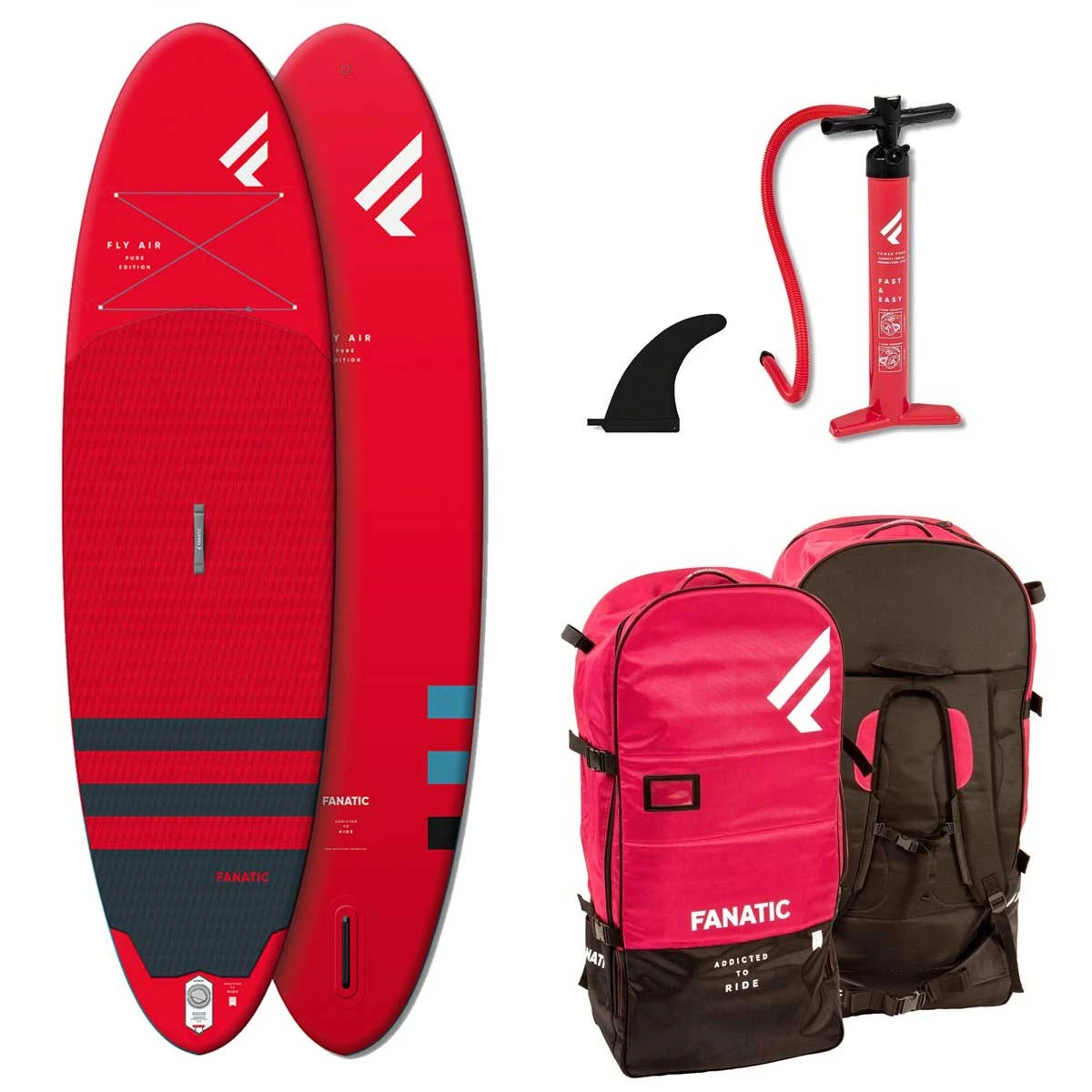 Lieferumfang: Fly Air 10’8″ SUP rot; dreiteiliges Pure Paddel; 19,5 cm US Finne; SUP Pumpe; Boardbag mit Rollen