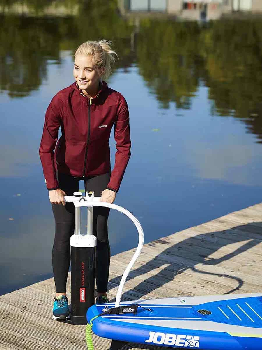 Mit Jobes Triple Action SUP Pumpe wird Aufpumpen zum Kinderspiel. Mit der Pumpe arbeitest du in drei Modi, mit voller Kapazität auf beiden Zylindern bis 5PSI, mittlerer Kapazität bis 10 PSI und hohem Druck auf einem einzelnen Zylinder bis 21PSI. In jedem Zylinder bewegst du pro Hub 3,5L Luft, den Fortschritt zeigt dir das Manometer im ergonomischen Griffstück an. Die Triple Action Pumpe kommt mit einem standardisiertem Aufsatz für alle SUPs. Mit breitem Fuß ist die Pumpe standsicher.
